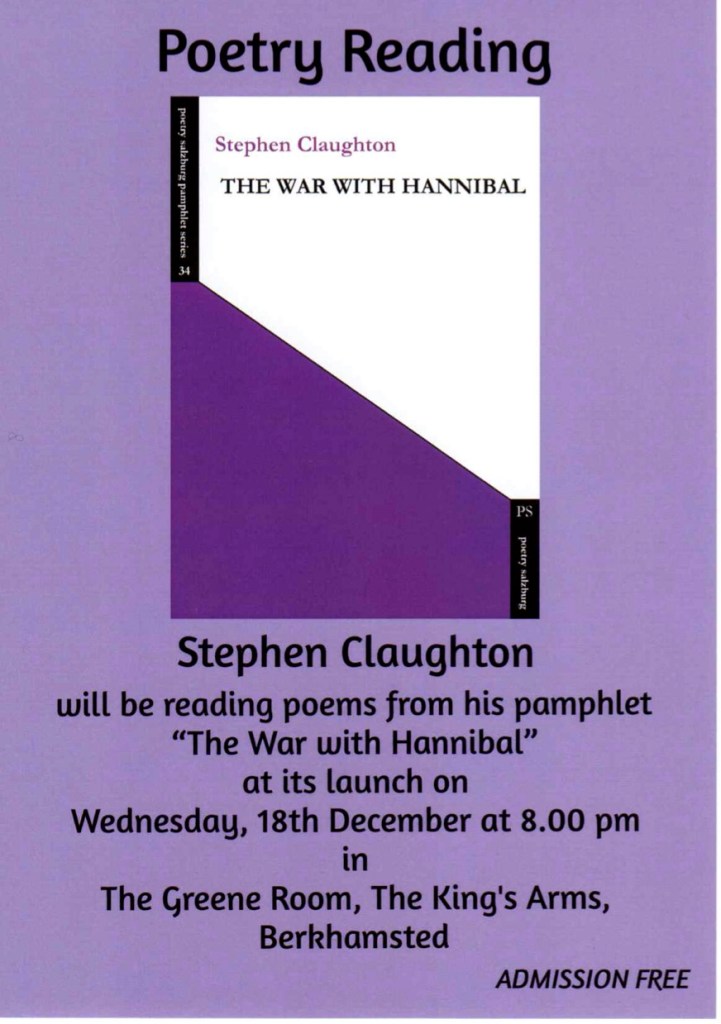 On 18 December, I launched my Poetry Salzburg pamphlet, The War with Hannibal, with a reading at the King’s Arms in Berkhamsted.